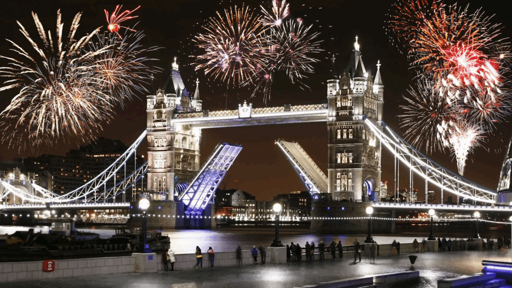 See in 2026 with London’s spectacular fireworks by the Thames. Big Ben strikes midnight before the city sky explodes in colour.