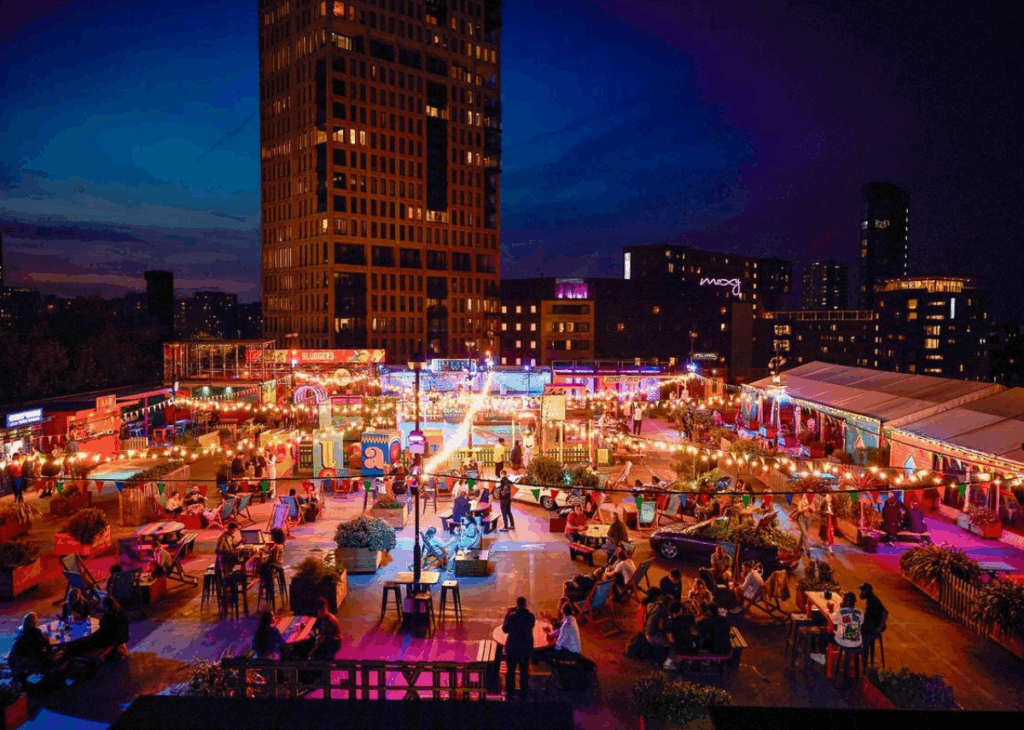 Why choose between drinks and entertainment when you can have both? Roof East in Stratford combines retro games, mini golf, street food, and cocktails for the ultimate group hangout experience.