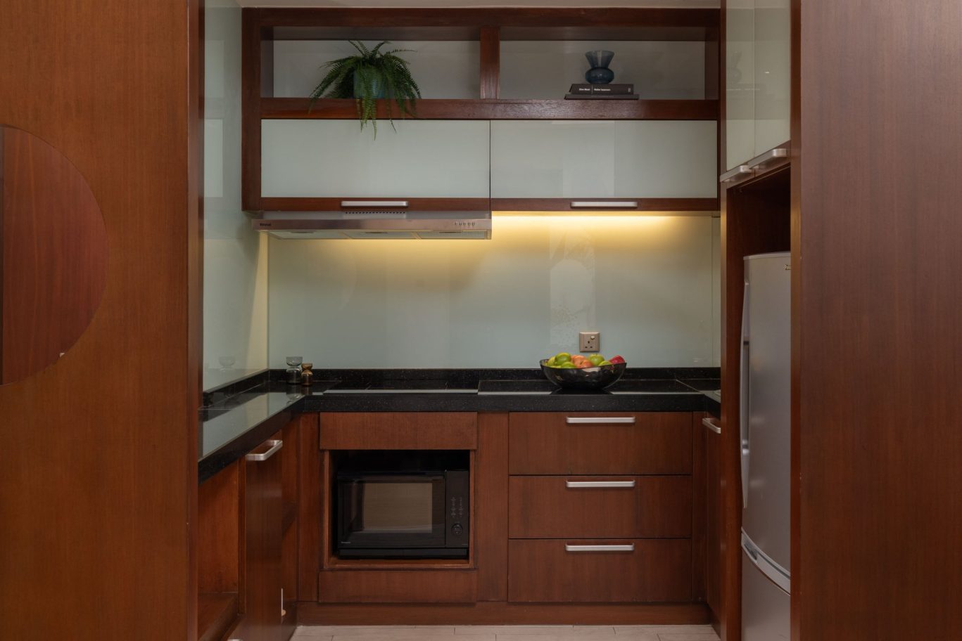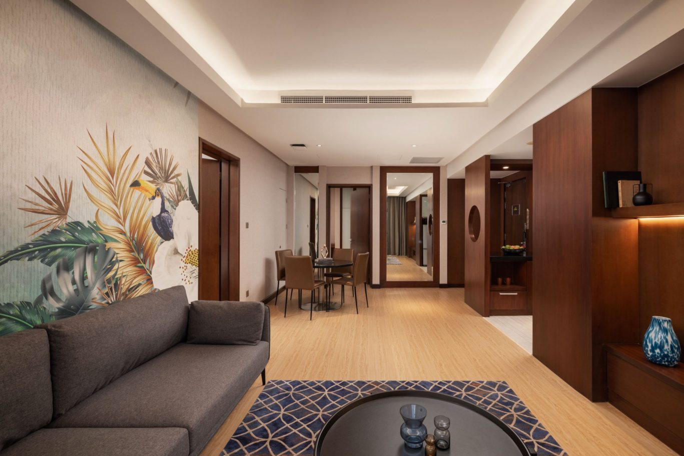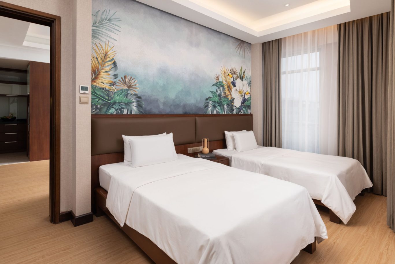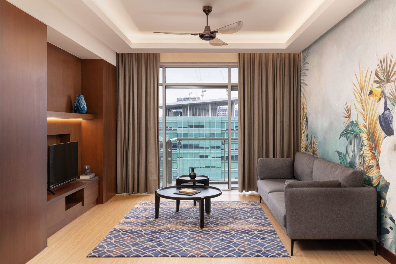 Decorated with vibrant murals and pops of colour against a neutral background, each Two-Bedroom Suite has two separate bedrooms and a living room with a sofa bed. Enjoy sweeping city views from the floor-to-ceiling windows and your own private balcony. Designed for the ultimate convenience, the modern kitchenette is equipped with useful features such as a combi oven, a two-door fridge and a water filter tap. Additional highlights include complimentary WiFi, a ceiling fan in the living room, a writing table, a LCD TV with satellite channels, a USB port and air-conditioning. Styled with neutral hues, modern fittings and premium materials, the ensuite bathroom has an invigorating rainfall shower and spacious bathtub, plush towels, bathrobes and slippers, and eco-friendly Ink & Water toiletries.